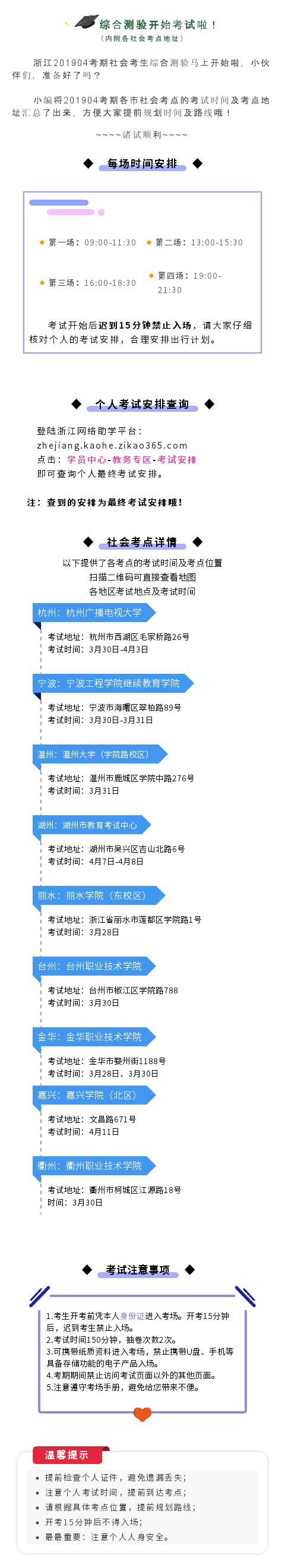 综合测验考试各考点考试时间及地址信息
